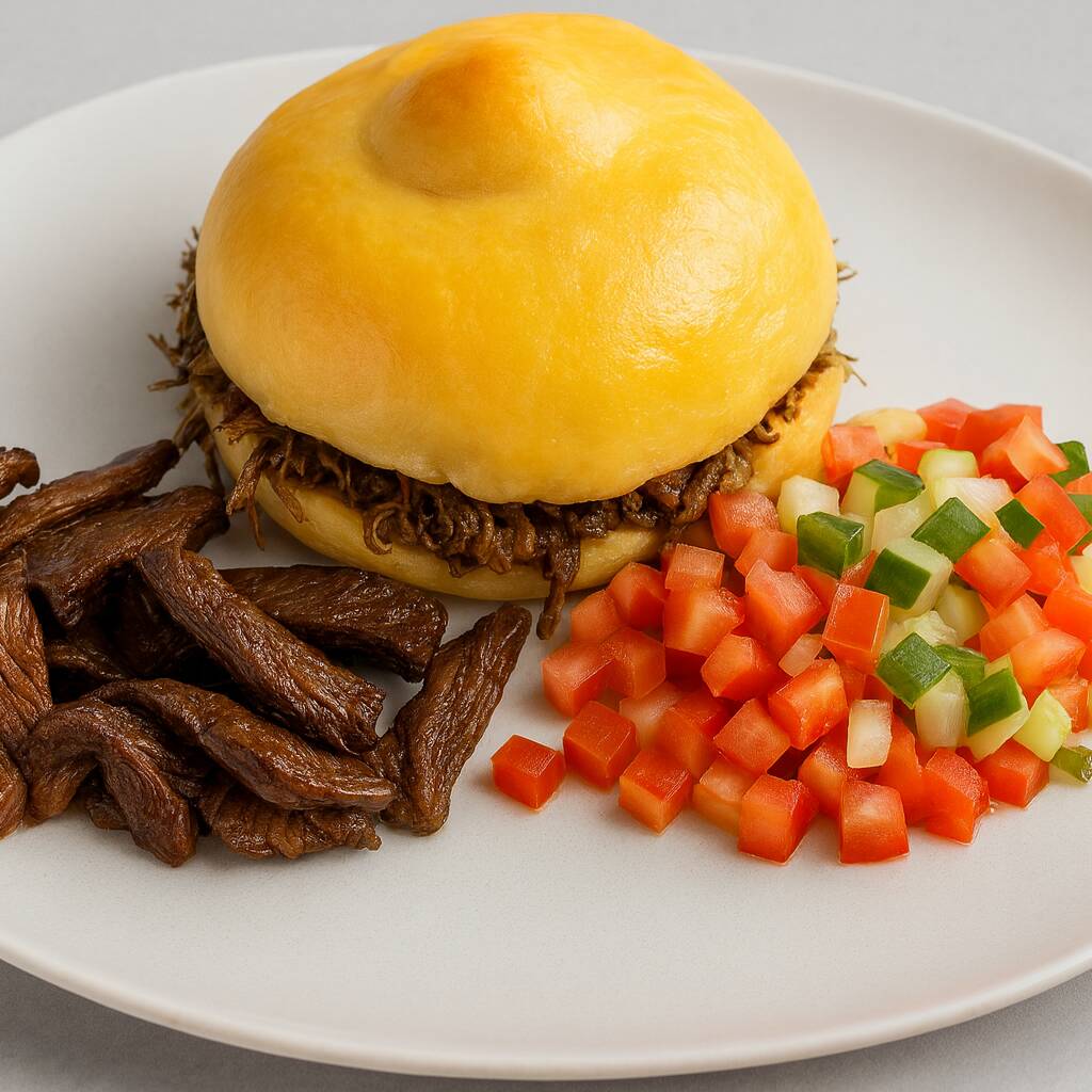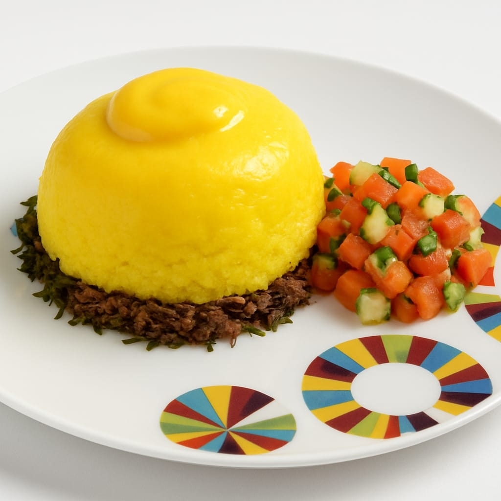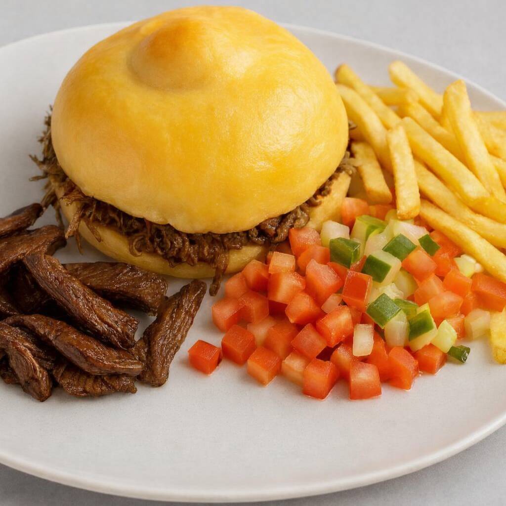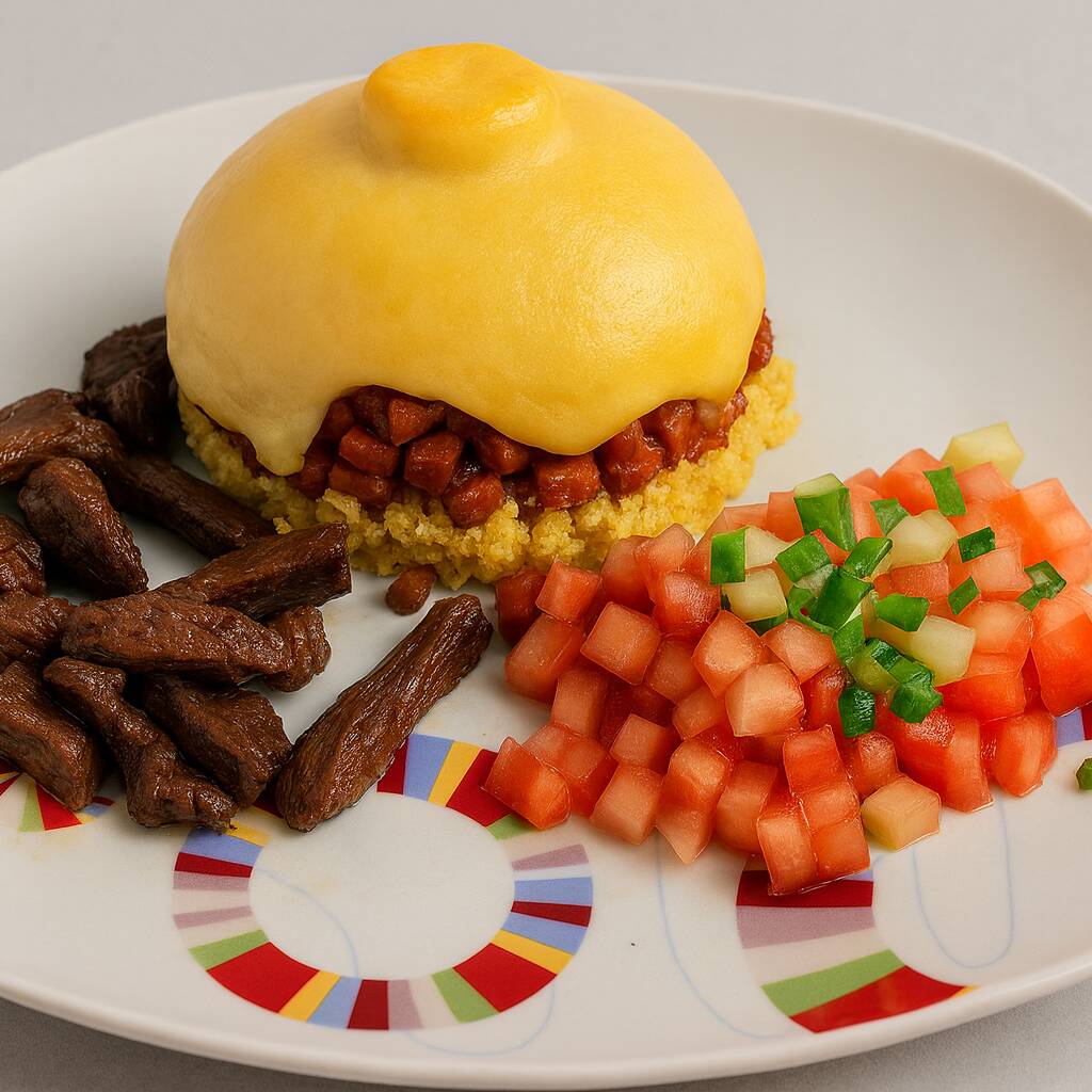 Cuscuz recheado com carne de sol desfiado, acompanhado de tiras de carne de alcatra grelhado, vinagrete fresco , batata frita e finalizado com queijo mussarela por cima, trazendo sabor e suculência em cada mordida.