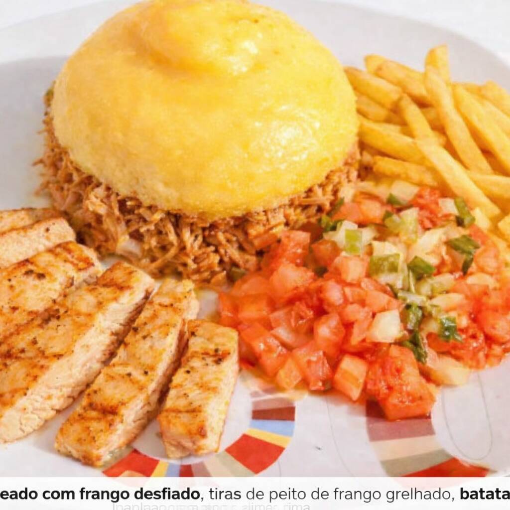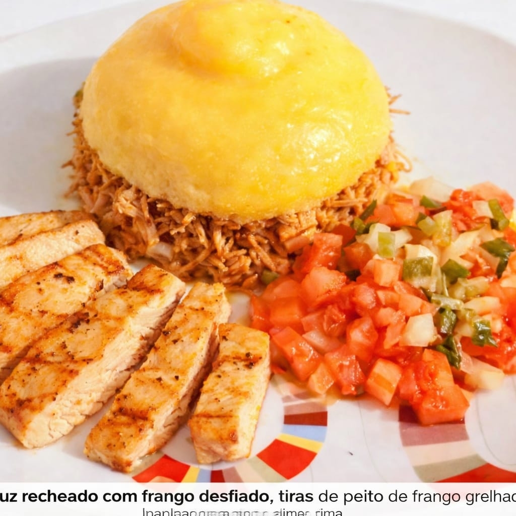 Cuscuz recheado com frango desfiado, acompanhado de tiras de peito de frango grelhado, vinagrete fresco, batata frita e finalizado com queijo mussarela por cima ,trazendo sabor e suculência em cada mordida.