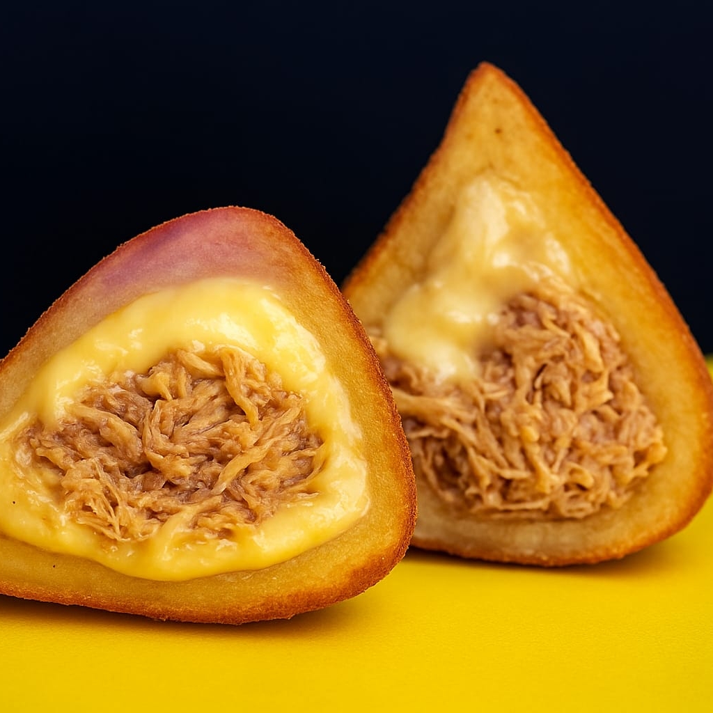 SALGADO FEITO COM MASSA DE BATATA, RECHEADO COM CALABRESA, QUEIJO MUSSARELA, CATUPIRY ORIGINAL E ORÉGANO.