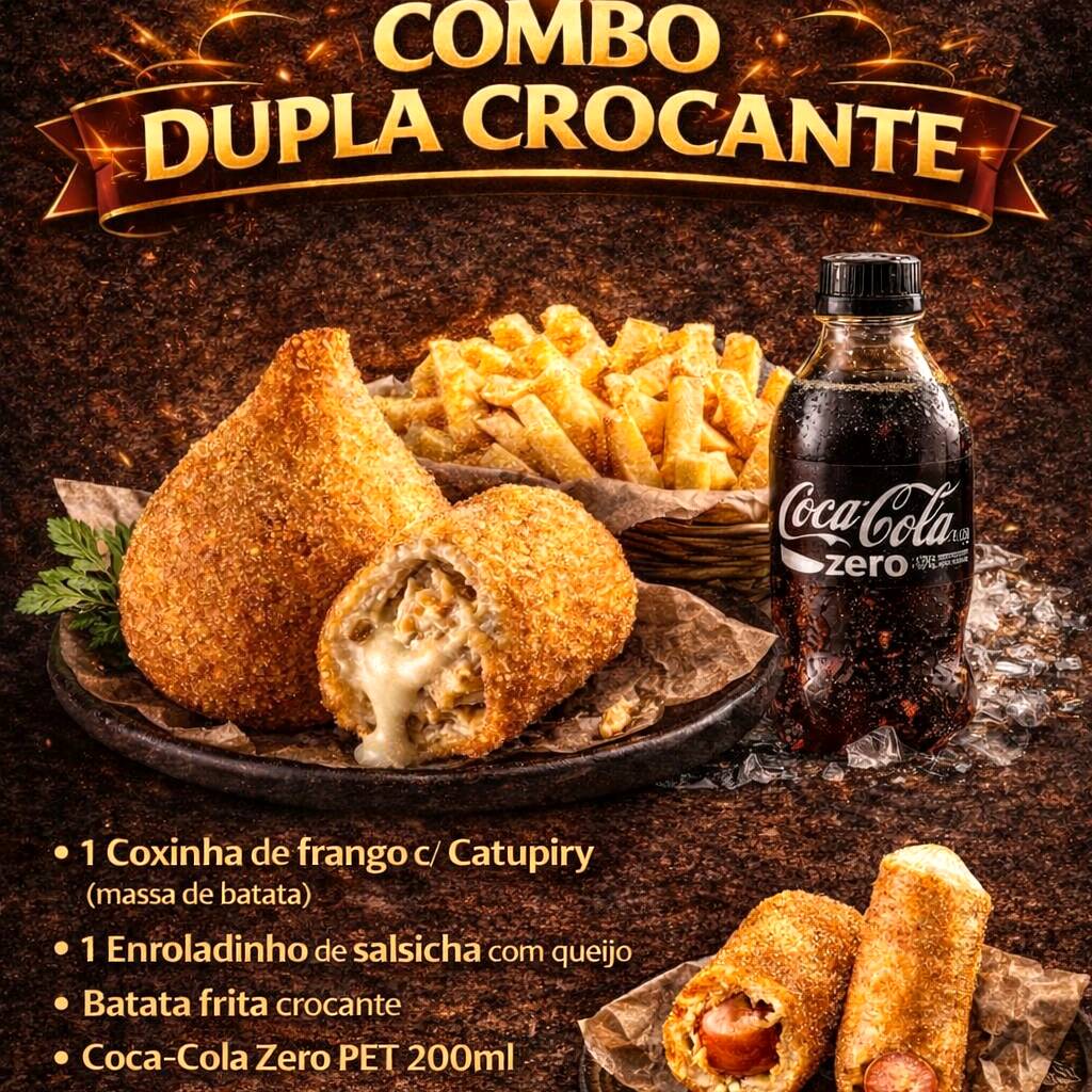 1Coxinha de frango com Catupiry (massa de batata), 1 enroladinho de salsicha com queijo, batata frita crocante e 1 Coca-Cola Zero PET 200ml. Um combo delicioso e crocante para matar a fome! 😋🍟🥤