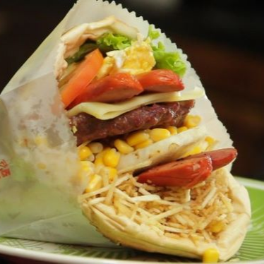 Pão, hambúrguer, ovo, Salsicha, muçarela, presunto, salada, milho, batata palha