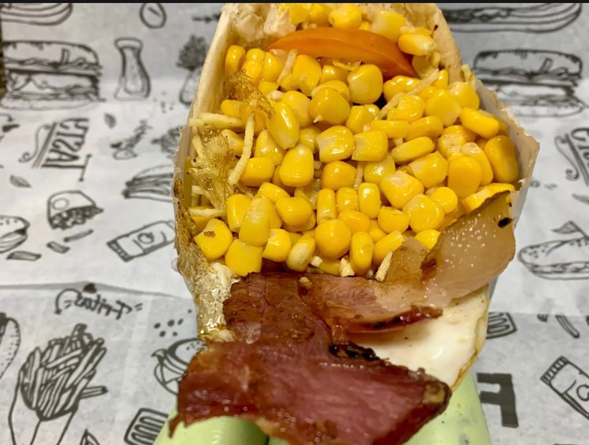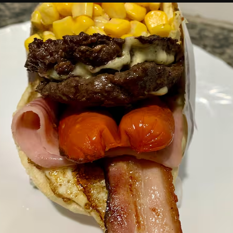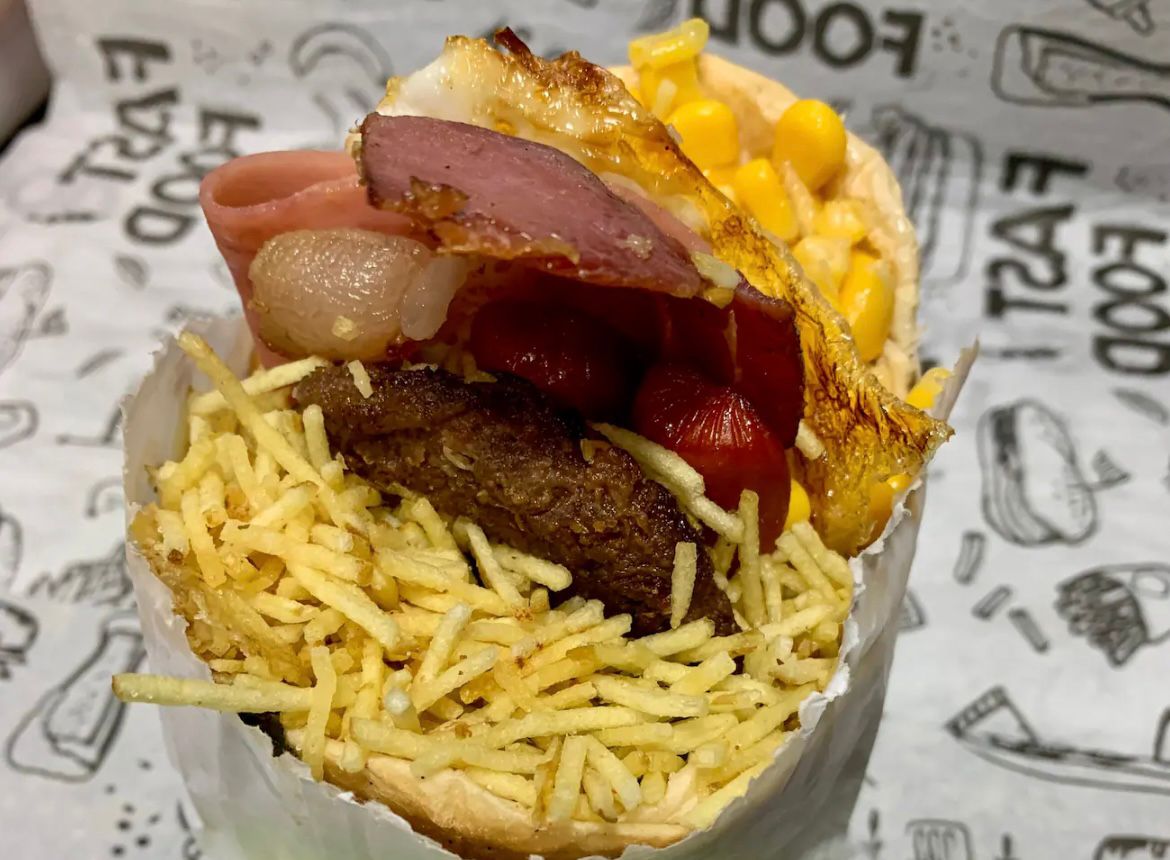 Pão, Bacon, Ovo, Salsicha, Mussarela, Alface, Tomate, Milho e Batata Palha