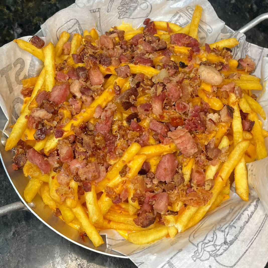 2 sanduiches com cebola empanada hamburguer molho verde cheddar , 2 sanduiches com hamburguer bacon salada molho verde barbecue , 500 gr de batata