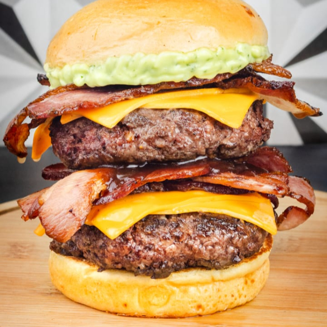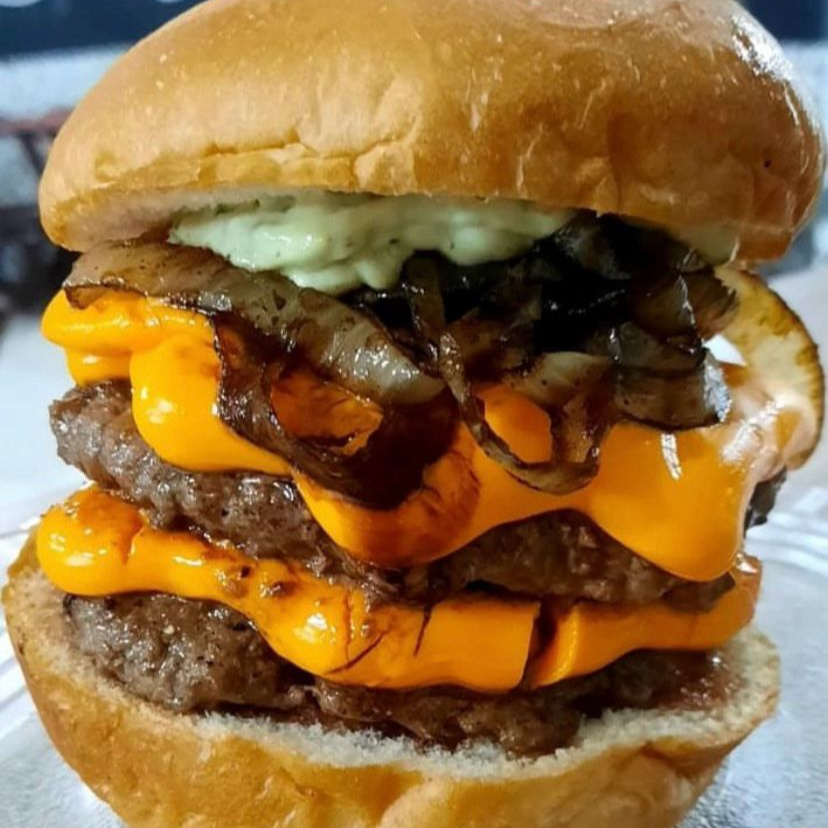 2 carnes , cheddar , cebola caramelizada, molho verde