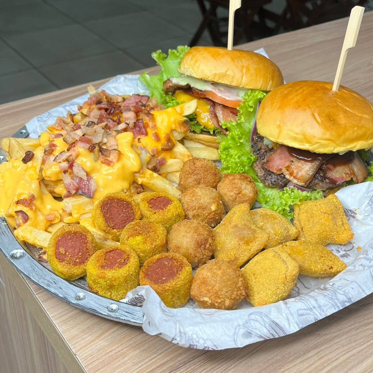 2 BURGUER TROPICAL , 500 GR DE BATATA RECHEADA, 4 ENROLADINHO DE SALSICHA ,4 BOLNHO DE CARNE SECAZ, 4 BOLINHO DE PIZZA