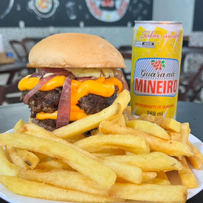 2 Hamburguer, Molho Chedder, Cebola caramelizada e molho verde.