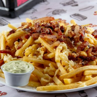 Porção de batata frita com molho de queijo mussarela , bacon picado e molho barbecue a parte