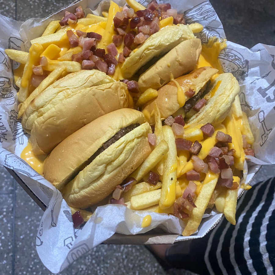 Pão brioche, hambúrguer artesanal com cheddar + batata c omcheddar e bacon !