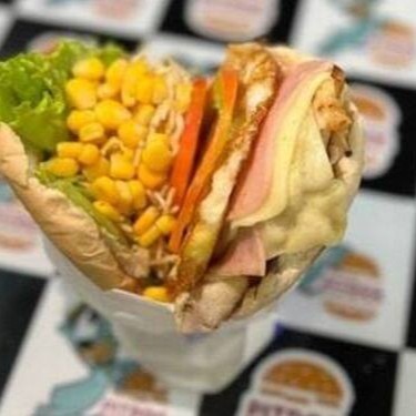 Pão , frango , mussarela , presunto, alface, tomate , milho e batata.