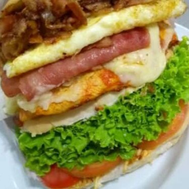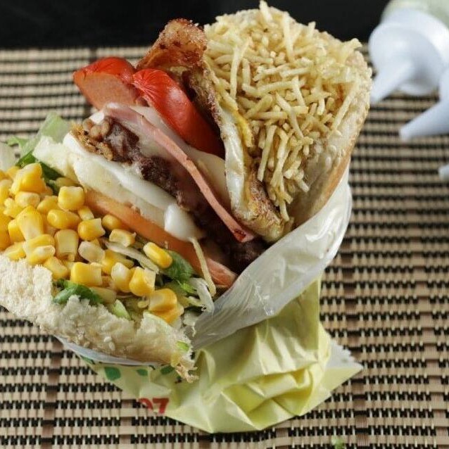Pão , 2 hamburguer ,2 mussarela ,2 presunto, 2bacon, 2ovo, 2salsicha , alface, tomate , milho e batata.
