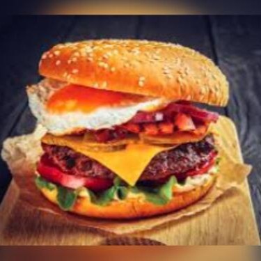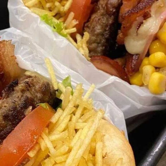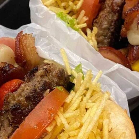 Pão gourmet , hamburguer , cheddar , ovo , bacon , salsicha ,alface ,tomate e cebola roxa.