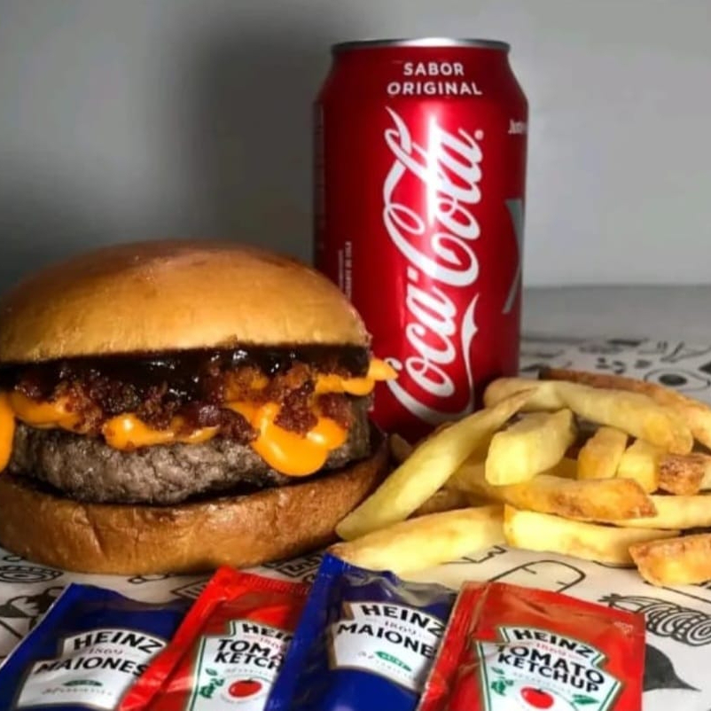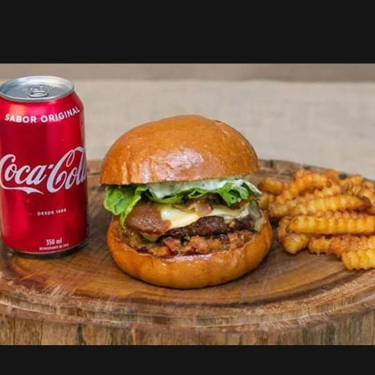 Esse lanche acompanha um burger bacon mais uma batata pequena e uma coca lata bem gelada