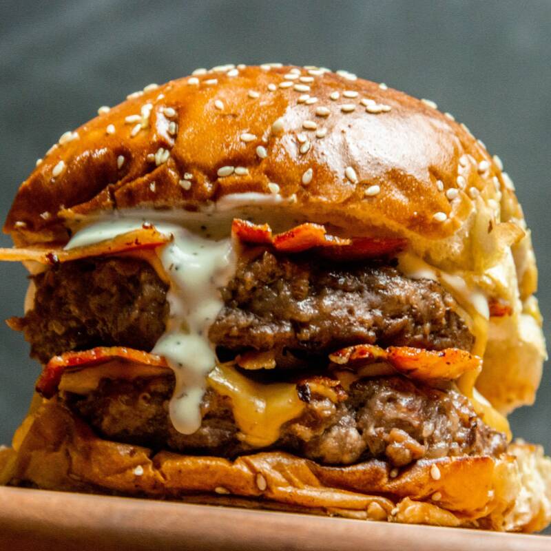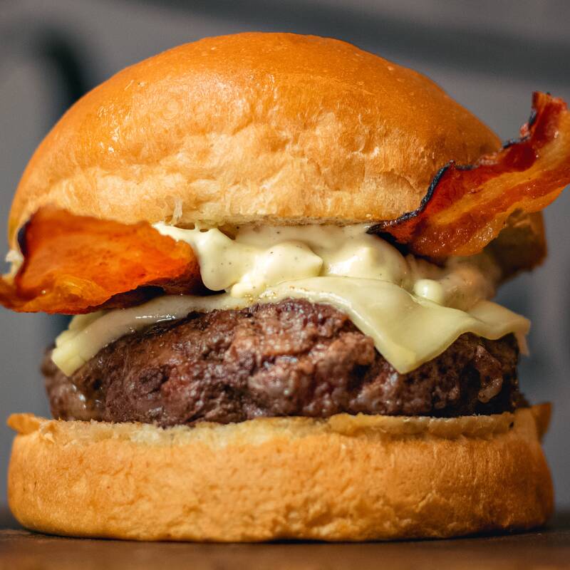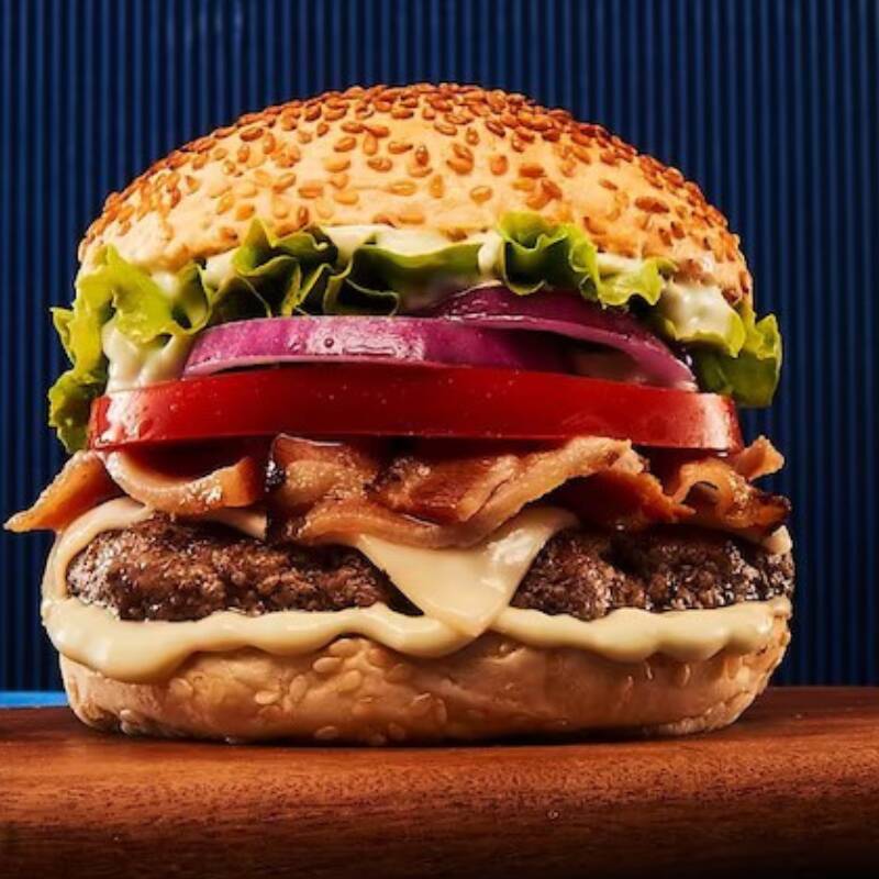 Duas carnes suculentas de 140g, queijo provolone derretido, quatro fatias de bacon crocante e molho de bacon no pão brioche. O lanche perfeito para os amantes de bacon e sabores intensos!