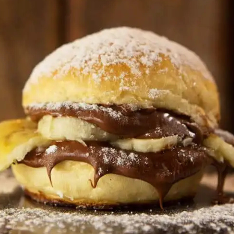 Pão brioche macio recheado com Nutella cremosa e fatias de banana fresca. Uma combinação irresistível de sabores que une o doce da banana com o toque suave de chocolate!