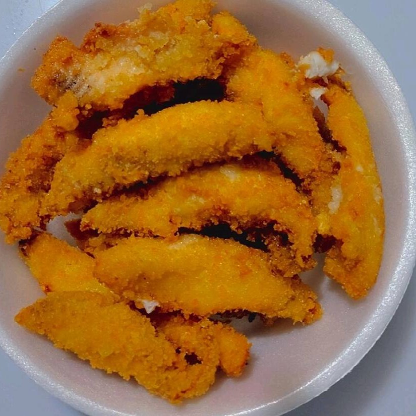 Filé de tilápia empanado e frito até ficar douradinho e crocante por fora, macio e suculento por dentro.
