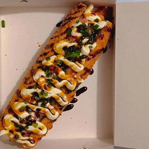 É um rolinho com aproximadamente 400g empanado e frito, com casquinha dourada e crocante, servido inteiro no formato de barca. Por cima, cream cheese cremoso e molho tare em zigue-zague, finalizado com cebolinha fresca picada e pedacinhos de salmão com cream cheese e um toque de shoyu.