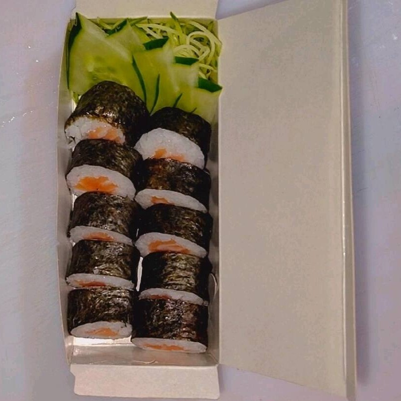 Salmão fresco envolto em arroz e alga nori, perfeitas para quem curte o sabor puro do peixe na medida certa.