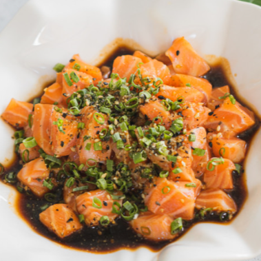 Cubos frescos de salmão e tilapia cortados ligeiramente alinhados, servidas crus com temperos especiais que realçam o sabor natural e a textura macia do peixe.