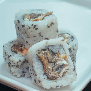 Uramaki recheado com pele crocante de peixe (skin), oferecendo uma textura crocante e sabor marcante que surpreende a cada mordida.