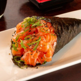 Fatias frescas de salmão enroladas em arroz e alga nori, com toque de wasabi e cebolinha. Praticidade e sabor direto na mão.
