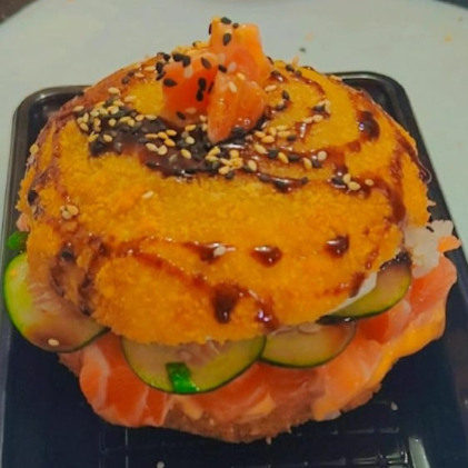 Uma criação absurda, montada uma base firme, recheio generoso, empanado crocante, dourado no ponto perfeito. No centro, salmão fresco cortado no talento, acompanhado de pepino laminado, trazendo equilíbrio e frescor. Por cima, um disco empanado ultra crocante, finalizado com molho tarê, gergelim branco e preto, É crocante por fora, macio por dentro e explosivo no sabor. Cada mordida entrega contraste e sabor.