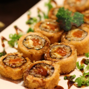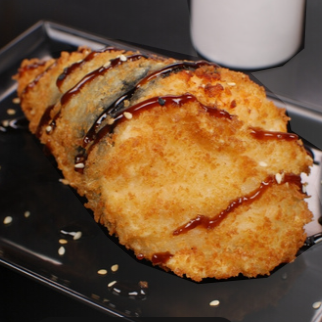 Enrolado empanado e crocante por fora, com recheio cremoso de salmão e cream cheese por dentro.