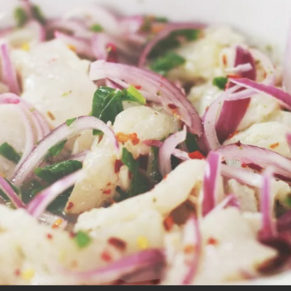 Cubos frescos de tilápia marinados no limão, com cebola roxa, cebolinha, pimenta dedo de moça, coentro e um toque especial da casa.