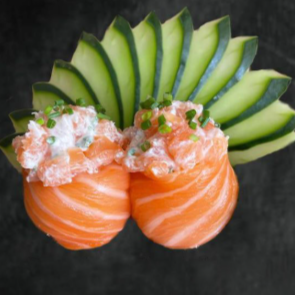 Feito com fatias frescas de salmão enroladas em arroz macio, finalizado com uma camada generosa de patê de salmão pouco apimentado junto com tempero do chefe cremoso por cima, uma explosão de sabor e textura a cada mordida.