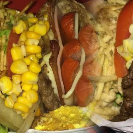 Pão, Filé, muçarela, salsicha, tomate, alface e milho.