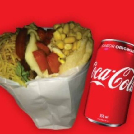 Pão, frango, muçarela, salsicha, tomate, alface e milho.