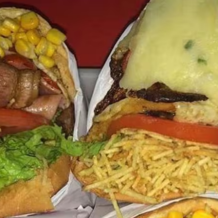 Pão, Hamburguer, muçarela, salsicha, tomate, alface e milho.