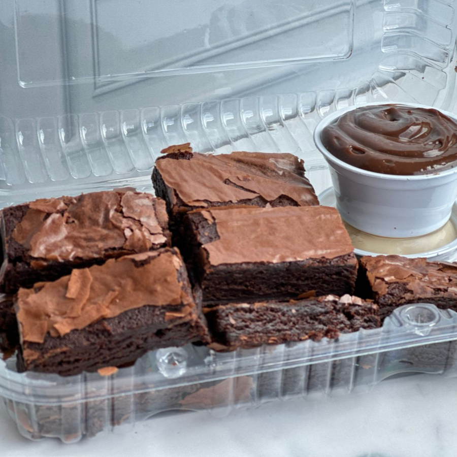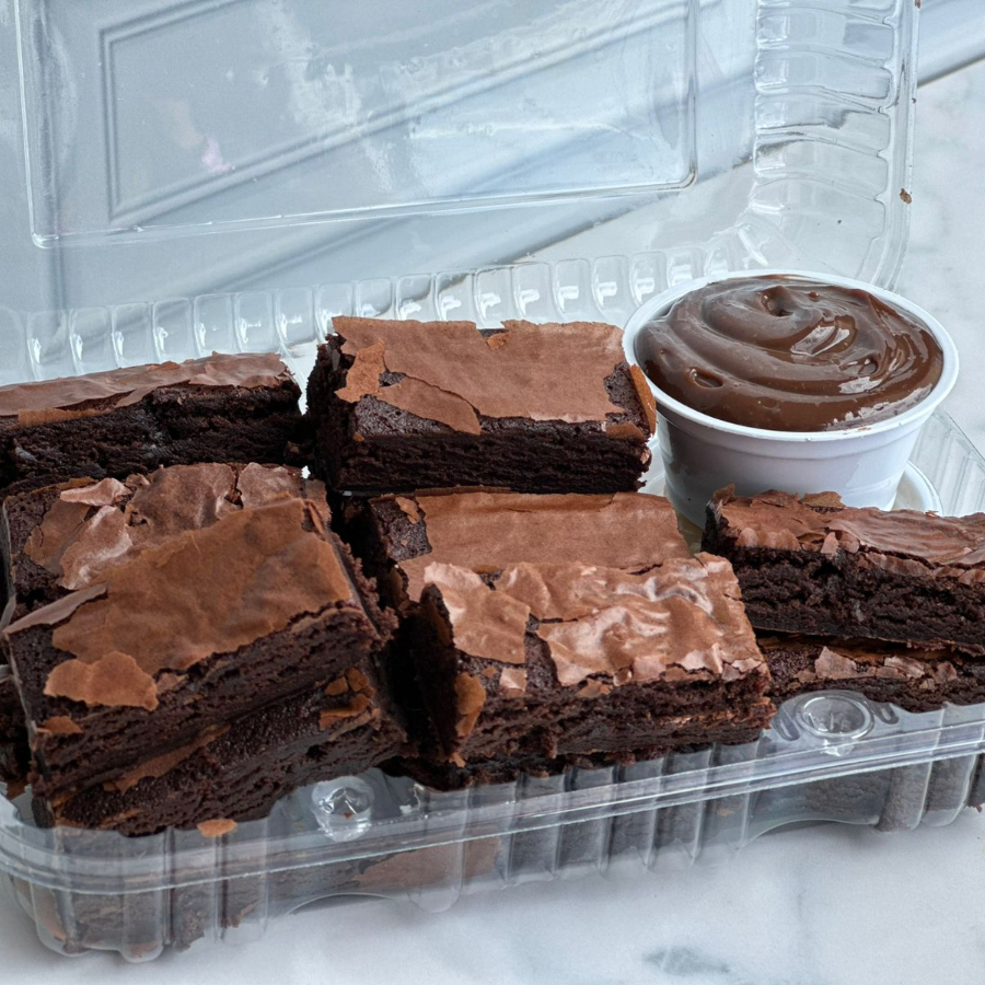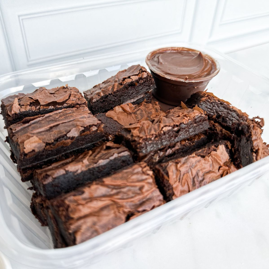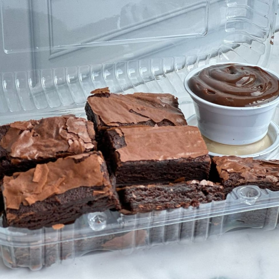 Brownie caseiro ultra chocolatudo para os apaixonados por chocolate. Massa macia, intensa e com explosão de sabor em cada mordida! Acompanha 2 potinhos com brigadeiro cremoso branco e brigadeiro de chocolate com aprox. 50g cada!