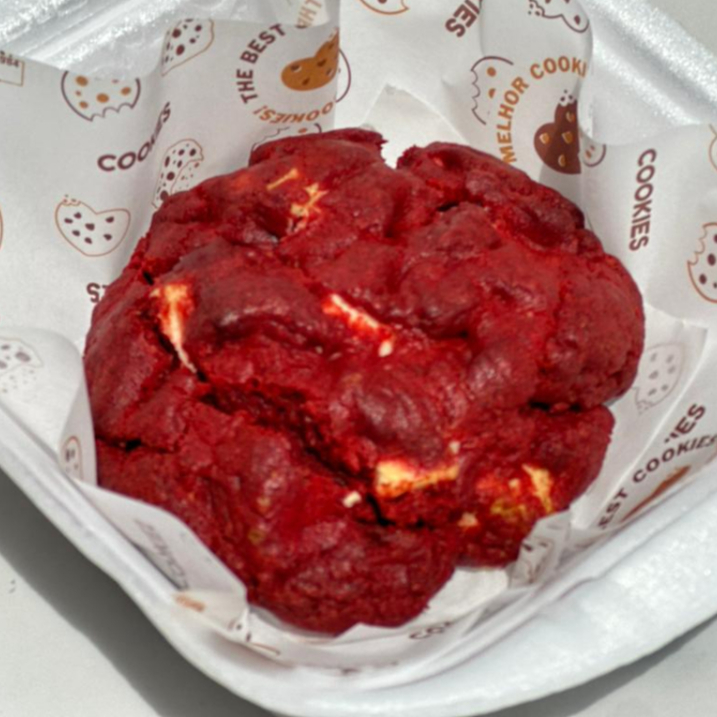 cookie red velvet massa de baunilha com chocolate branco , crocante por fora macio por dentro, peso aprox.100g