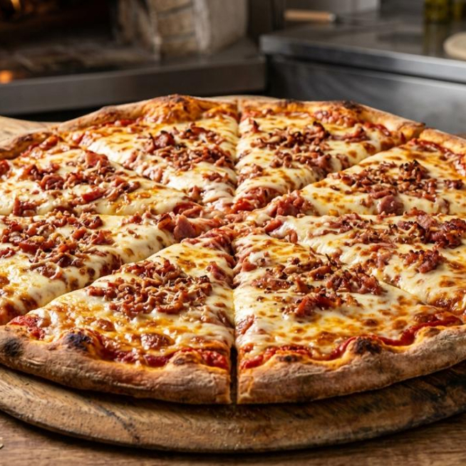 MASSA, MOLHO DE TOMATE, BACON,CEBOLA, TOMATE E ORÉGANO