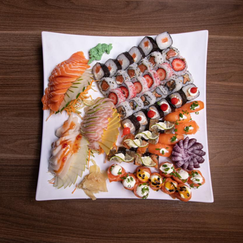 3 sashimi de salmão 3 sashimi de tilápia 2 niguiri 1 tataki 8 sushi variados 2 goy de salmão 4 gunkan creme chesse 2 gunkan goiabada com nutela 1 carpaccio de salmão 1 carpaccio de tilápia 1 ceviche 10 hot(acompanha te 1 unidade de cada molho e 2 pares de hashi)