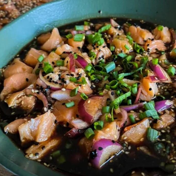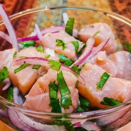 Pequenos cubos de salmão com limão coentro cebola roxa pimenta dedo de moça e pimenta de cheiro