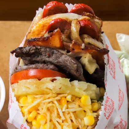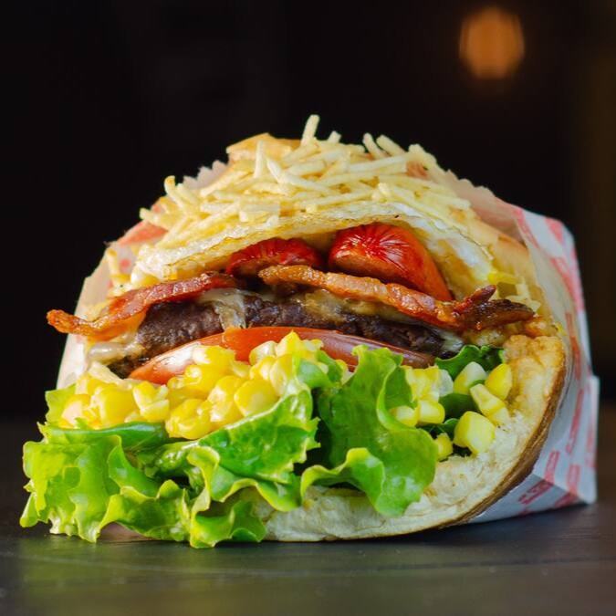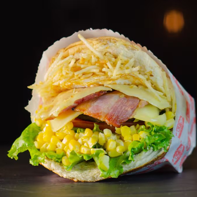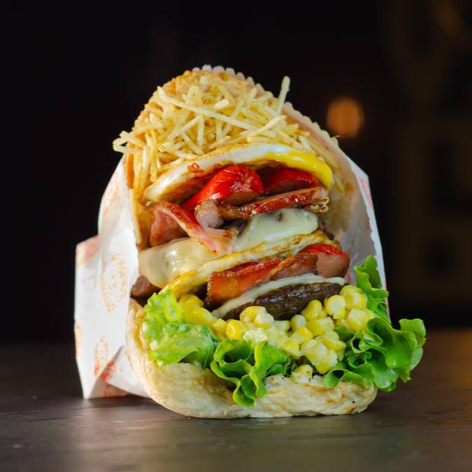 Carne Generosa, Duplo Bacon, Duplo Queijo, Dupla Salsicha, Ovo, Alface, Tomate, Milho E Batata No Pão Macio.