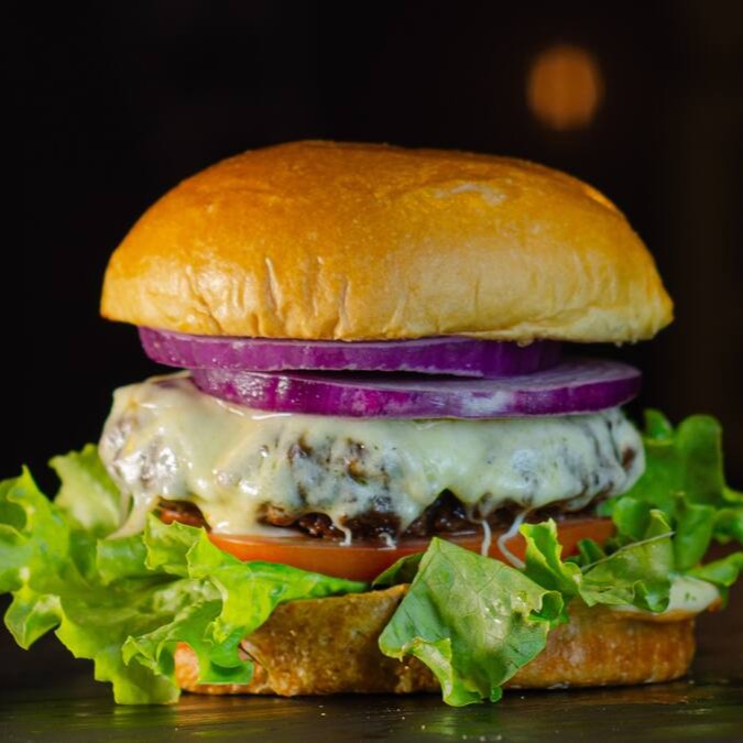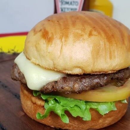 Hambúrguer Artesanal Com 200g De Blend Bovino, Mussarela Derretida, Alface Americana, Tomate E Cebola Roxa No Brioche Macio.