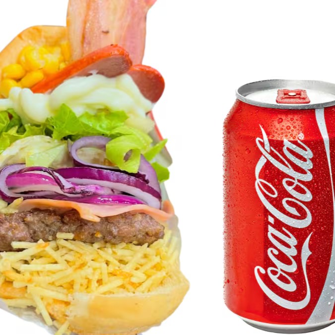 X Tudo Hambúrguer Bovino, Bacon, Ovo, Salsicha, Mussarela, Alface, Tomate, Milho, Batata + Coca-Cola Lata 350ml Gelada.