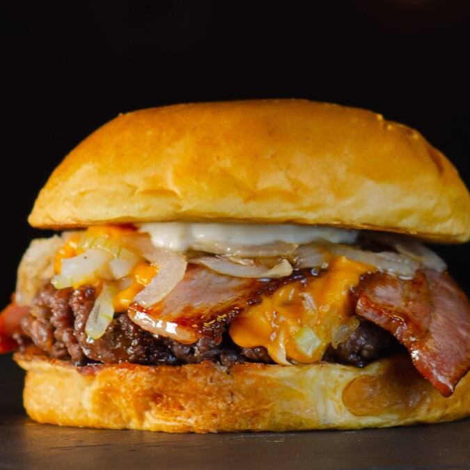 Blend Bovino De 180g Com Queijo Cheddar, Bacon Crocante E Cebola Caramelizada No Brioche Macio.