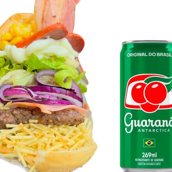 X Tudo Hambúrguer Bovino, Bacon, Ovo, Salsicha, Mussarela, Alface, Tomate, Milho E Batata + Guaraná Antarctica Lata 269ml Gelado.