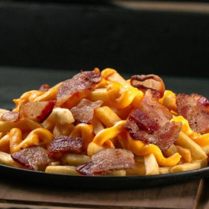 Batata Frita Crocante Com Bacon Dourado E Cheddar Cremoso Derretido. Uma Porção Generosa Cheia De Sabor!