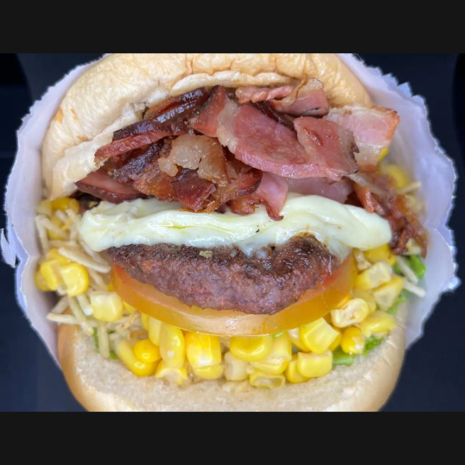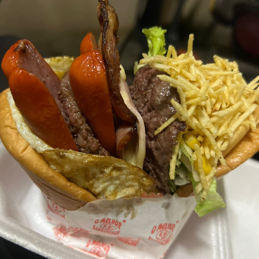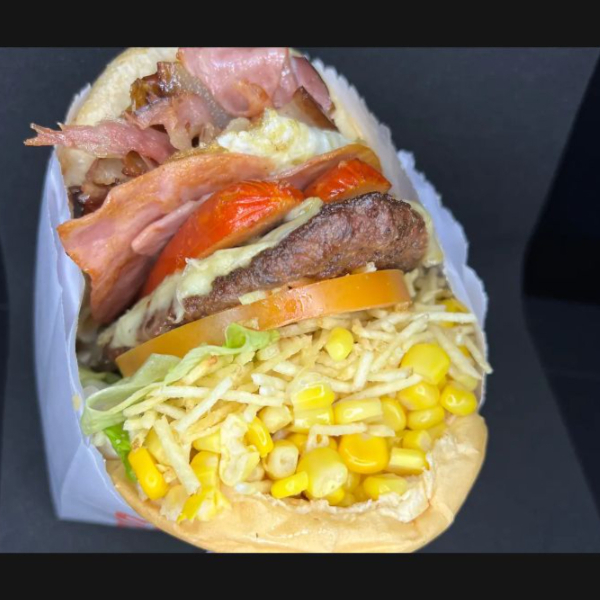 Pão,2 Hambúrguer, presunto, mussarela, bacon, 2 salsicha, ovo alface, tomate, milho e batata palha.