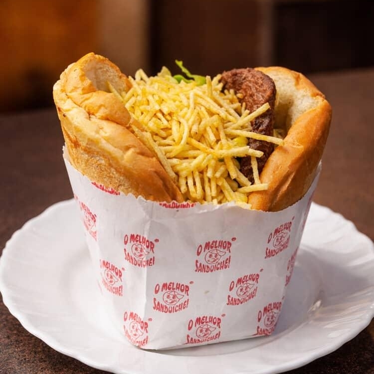 Pão, Hambúrguer, presunto, mussarela, bacon, salsicha, ovo alface, tomate, milho e batata palha