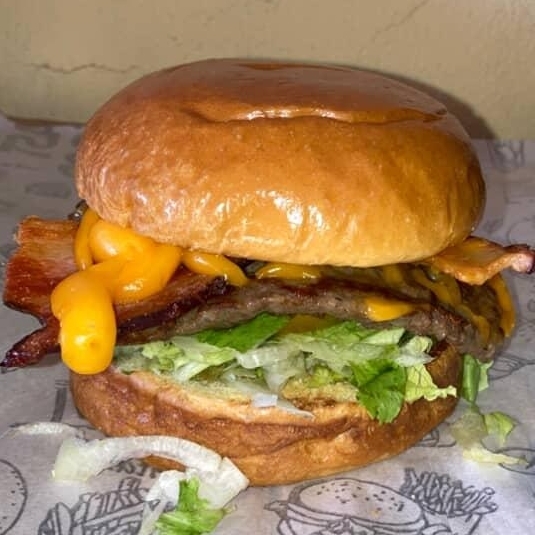 Pão, 2 hambúrguer, 2bacon, 2mussarela, abacaxi, cheddar, alface e tomate.