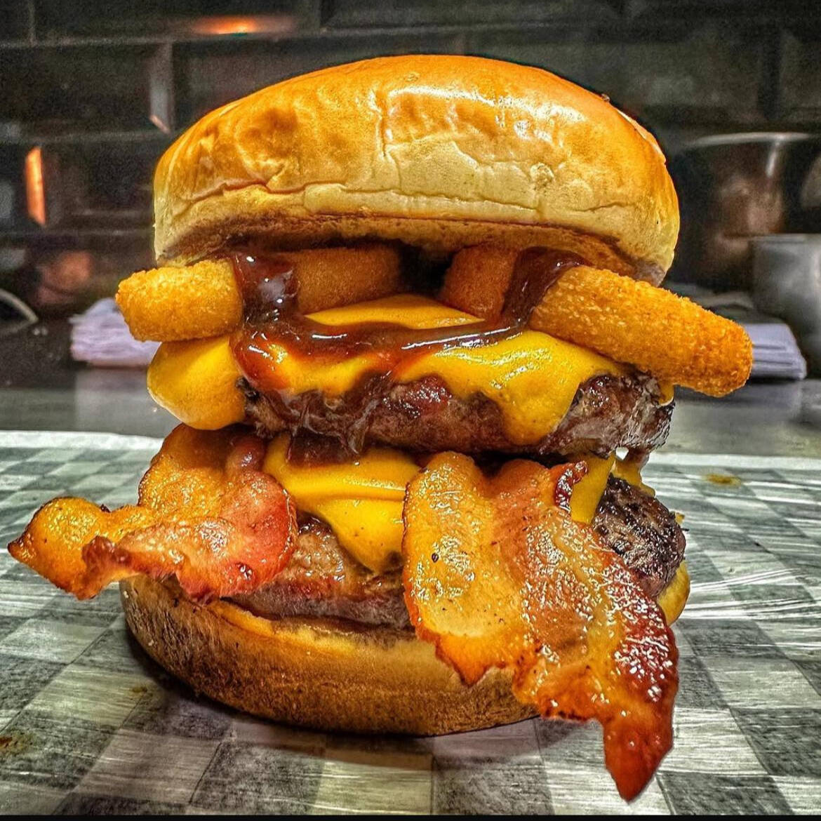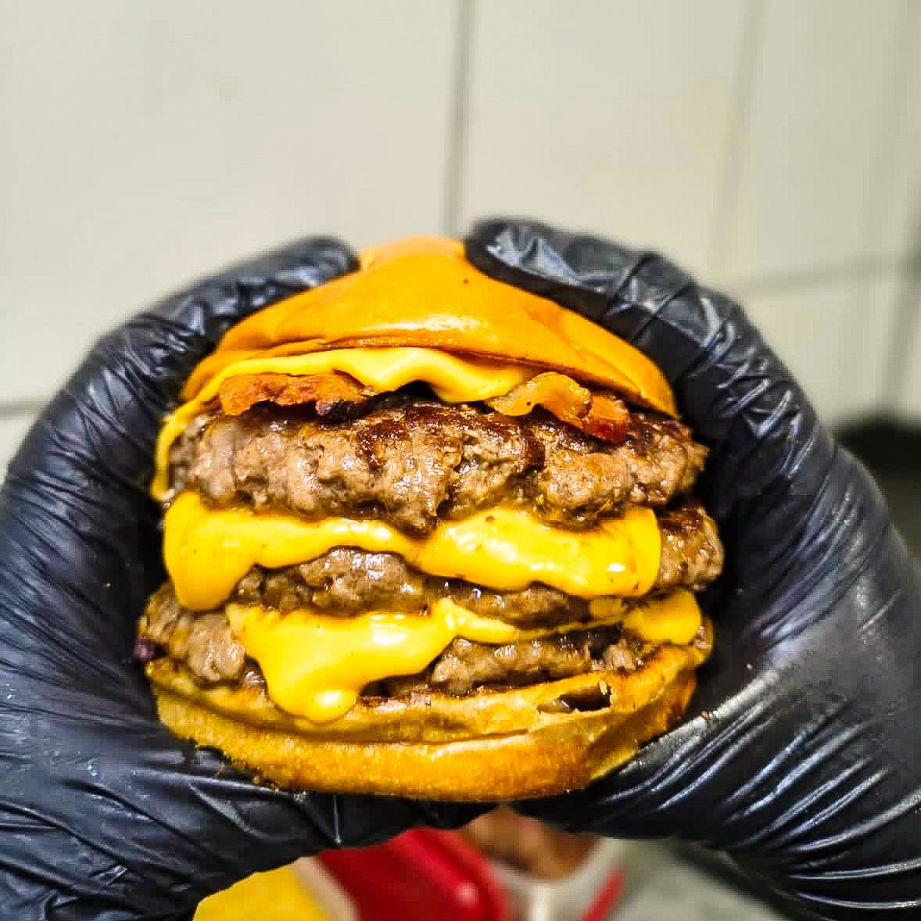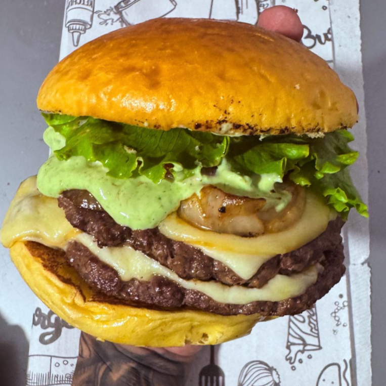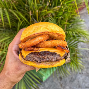 Pão Brioche selado na Manteiga, Hamburgão Smash de 140G, Queijo Cheddar Cremoso, Bacon Defumado, 02 Aneis de celola + Molho Barbecue e Molho da casa.
