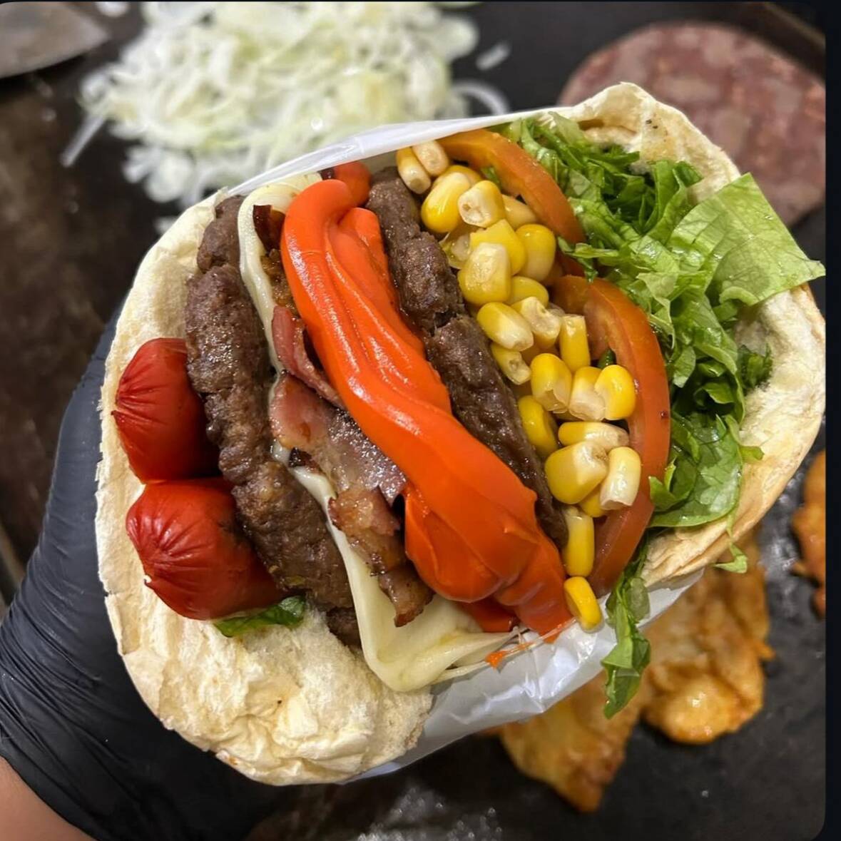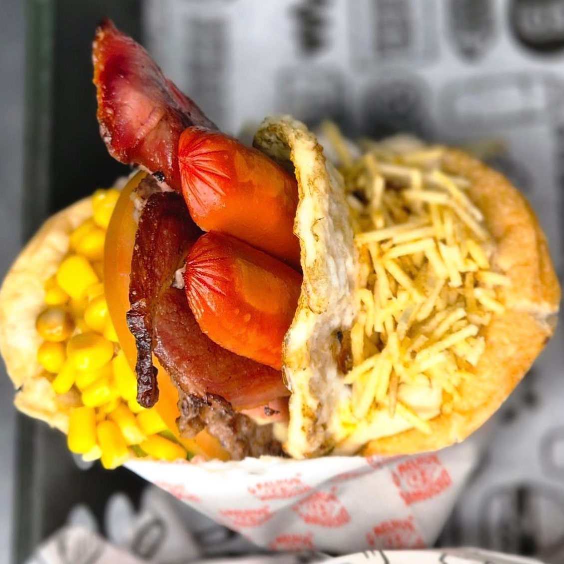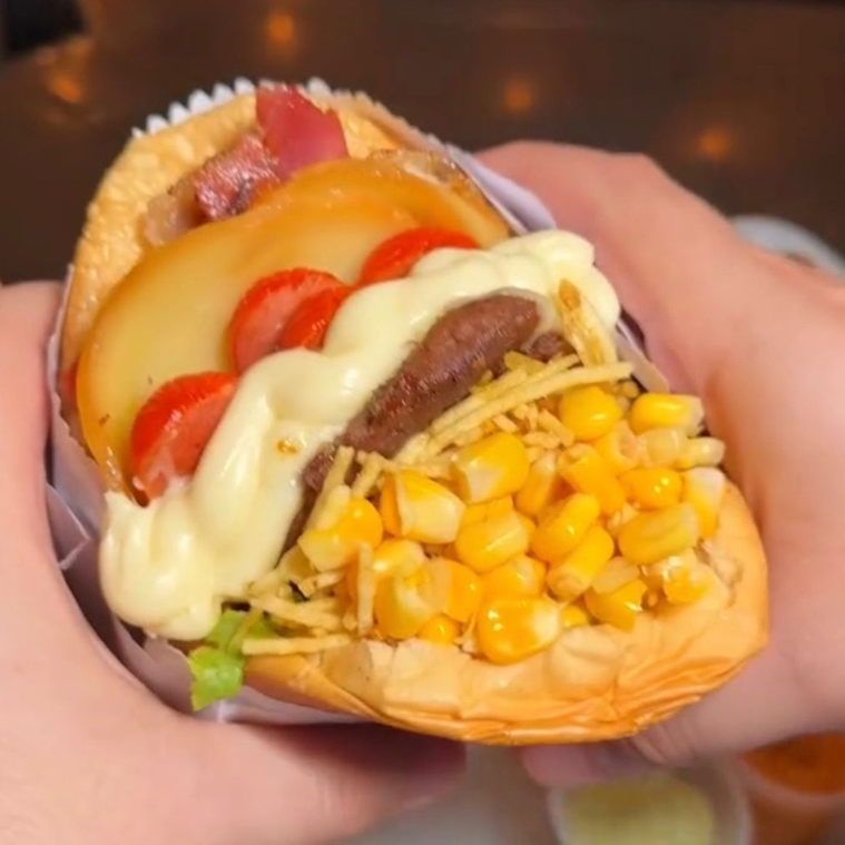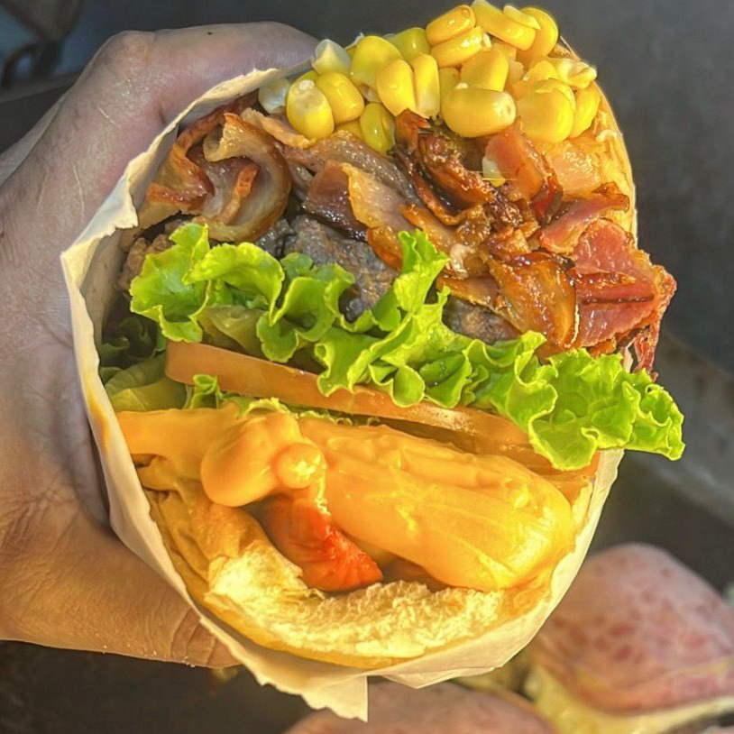Pão Macio por fora e Crocante por Dentro, Hambúrguer Suculento, Salsicha grelhada, Queijo Derretido, Ovo, Tomate Fresco e Alface Crocante, Milho e Batata Palha Mega Crocante