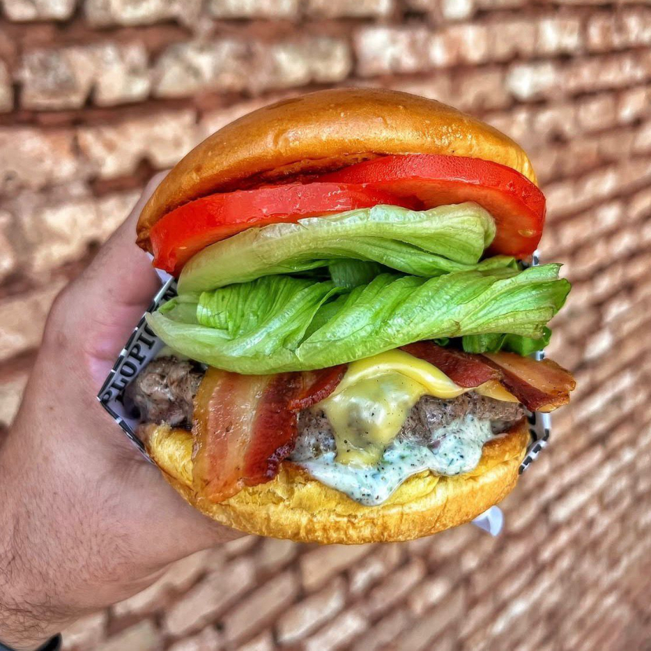 = Pão Macio, Hambúrguer Suculento ,Bacon Defumado Queijo Derretido, Alface Crocante, Milho e Batata Palha Mega Crocante. Do jeito que Goiano Manda.