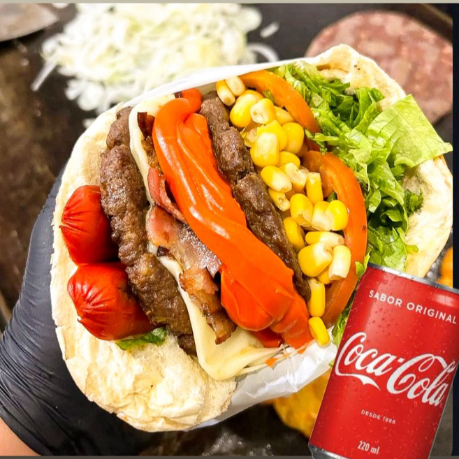 Pão Macio por fora e Crocante por Dentro, Hambúrguer Suculento, Ovo, Bacon Crocante, Salsicha, Presunto Fatiado, Queijo Derretendo, Tomate Fresco e Alface Crocante, Milho e Batata Palha Mega Crocante. + Coca Cola ou Guarana Lata 220 Ml. O Clássico que dispensa mais detalhes.