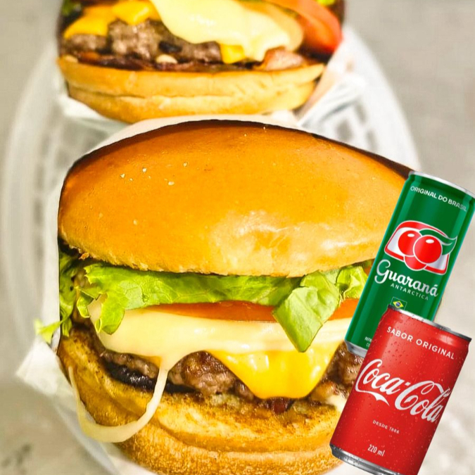 São dois Classicos Pão Brioche selado na manteiga , Blend secreto de 140 Gramas , Queijo Derretendo, salada Fresquinha e crocante e o molho verde secreto da Casa. ( acompanha dois Refrigerantes lata Guarana ou coca cola Conforme Disponibilidade e estoque)